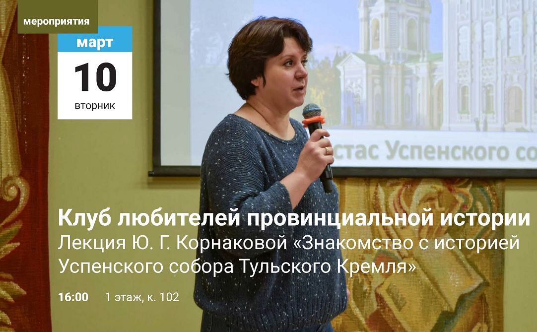 10 марта в 16:00 в клубе любителей провинциальной истории Тульской областной научной библиотеки состоится лекция Юлии Геннадьевны Корнаковой, заведующей отделом Музея имени Андрея Рублева в Туле, посвященная Успенскому собору Тульского кремля, жемчужине города, уникальному архитектурному и живописному комплексу XVIII века, практически полностью сохранившемуся до нашего времени.