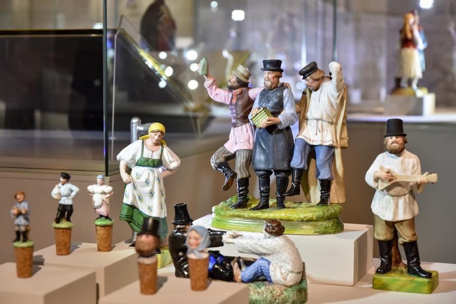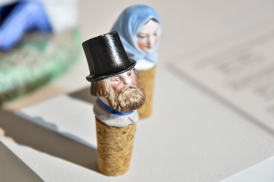 Кроме того, наибольшее любопытство вызывают крошечные скульптурки на деревянном основании. Это пробки. Каждая фарфоровая статуэтка имеет нарезной штифт, который ввинчивался в дерево. Пробками затыкали штофы и бутылки, которые были неотъемлемой частью любого застолье.