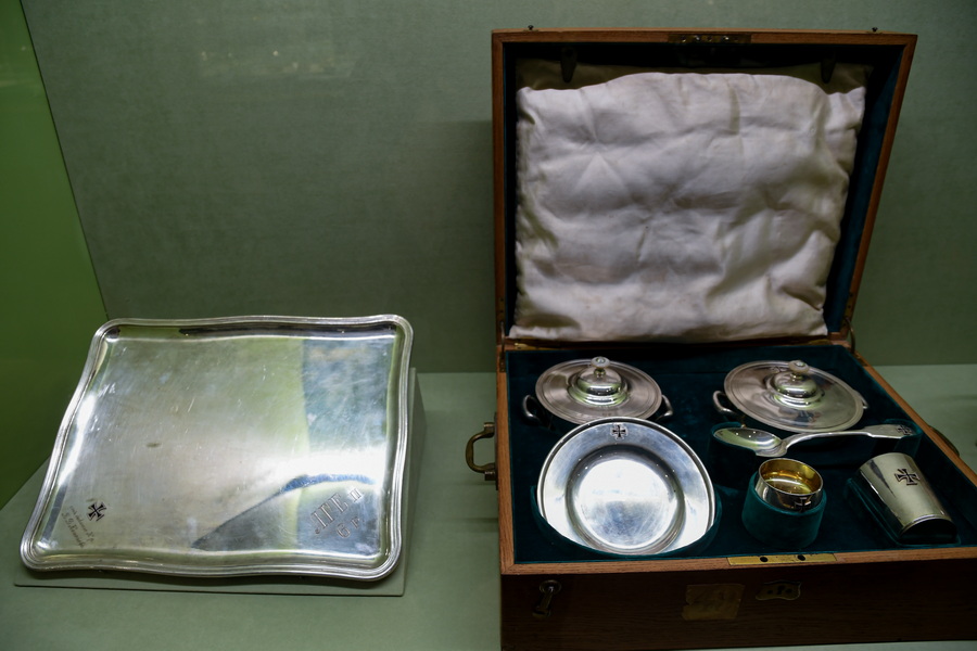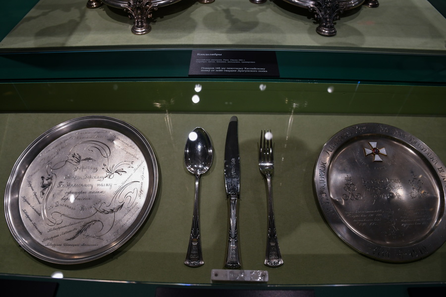 – На выставке мы постарались представить российскую армию в целом, – рассказал заведующий сектором научно-экспозиционного отдела Государственного исторического музея Константин Игошин. – Здесь представлены трофеи, оружие, ключи захваченных крепостей. Основная часть выставки посвящена полковому застолью с красивыми серебряными сервизами. Кроме того, здесь находится большое количество ювелирных изделий и полковых реликвий.